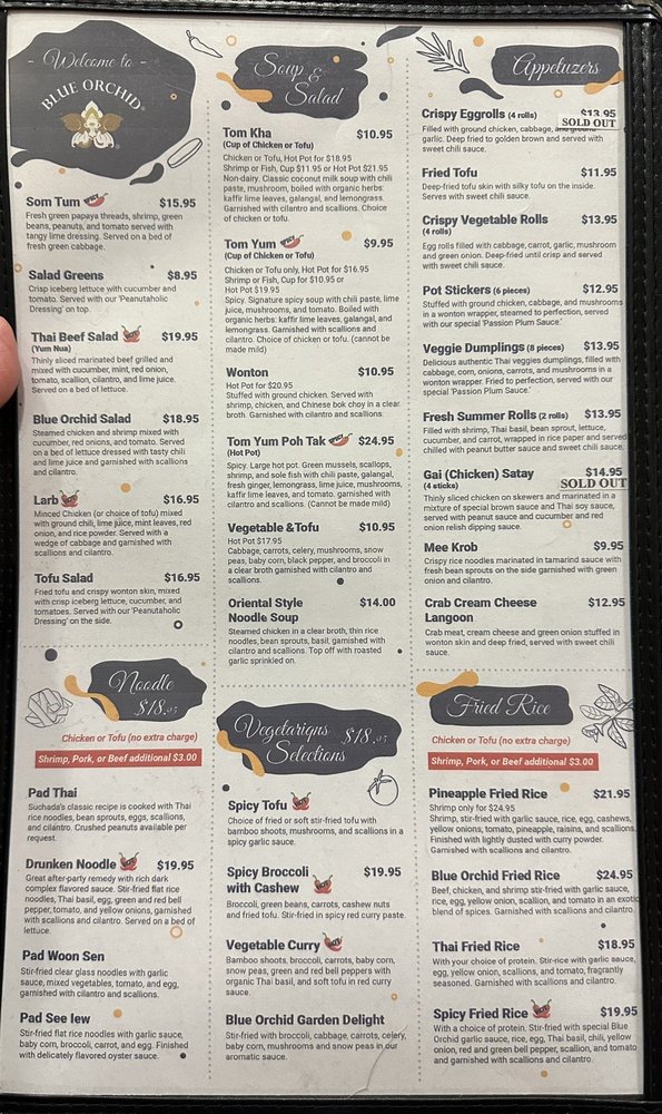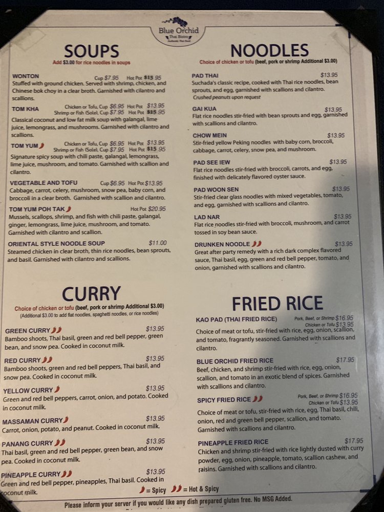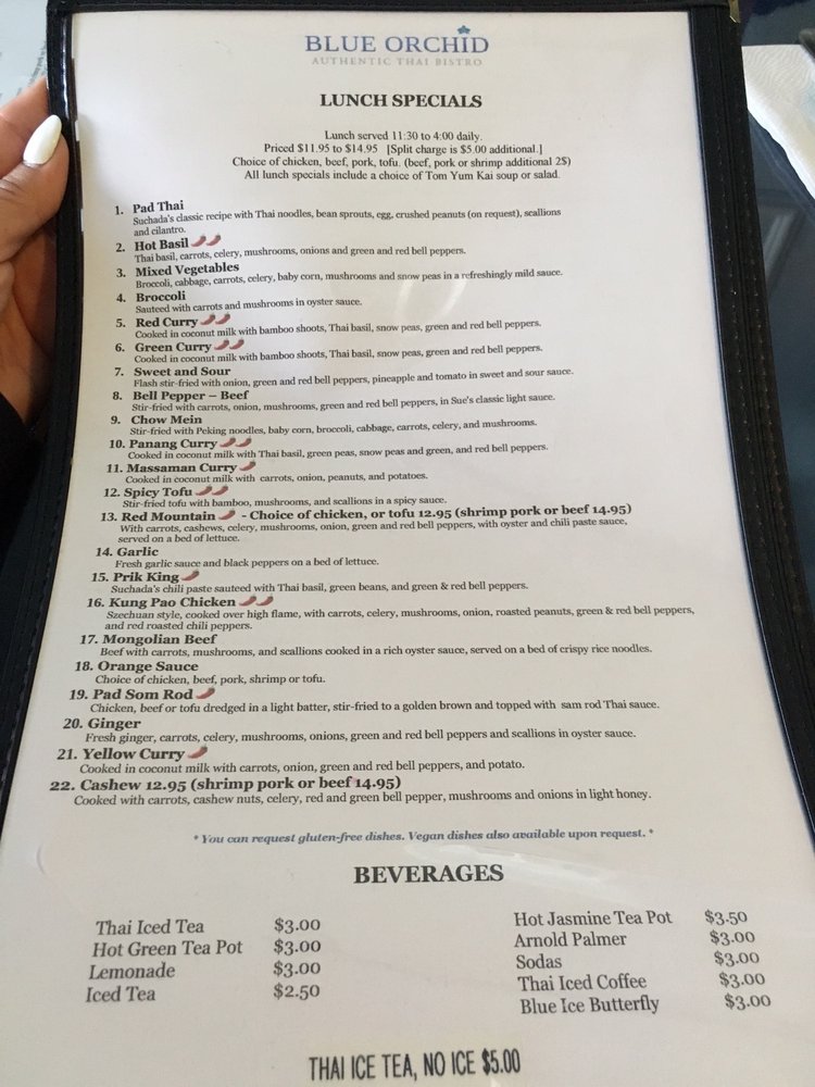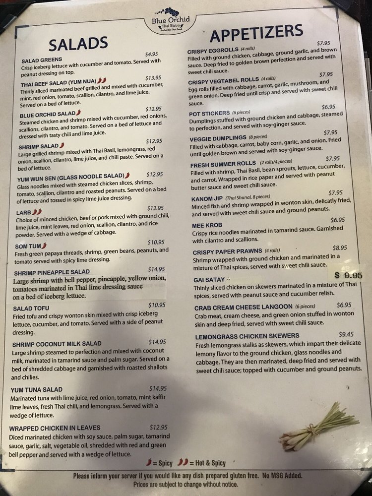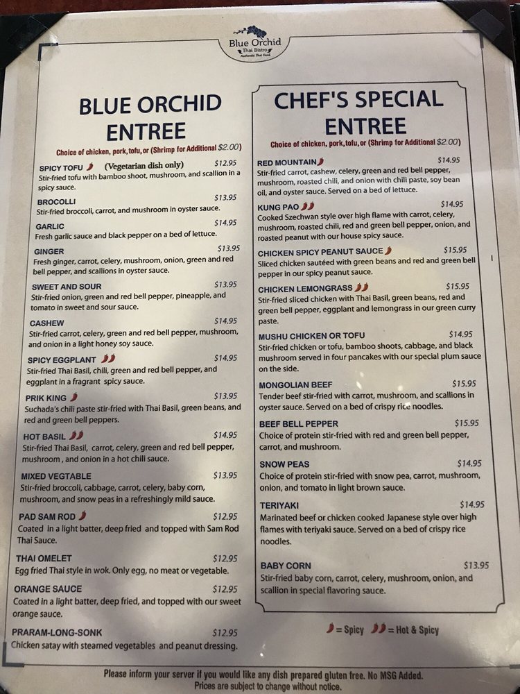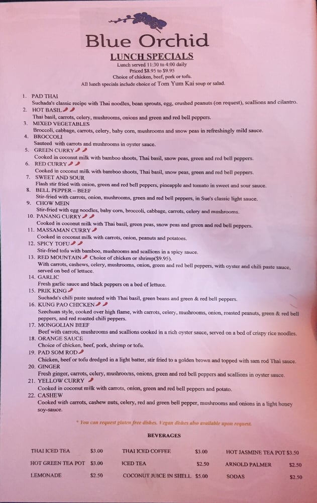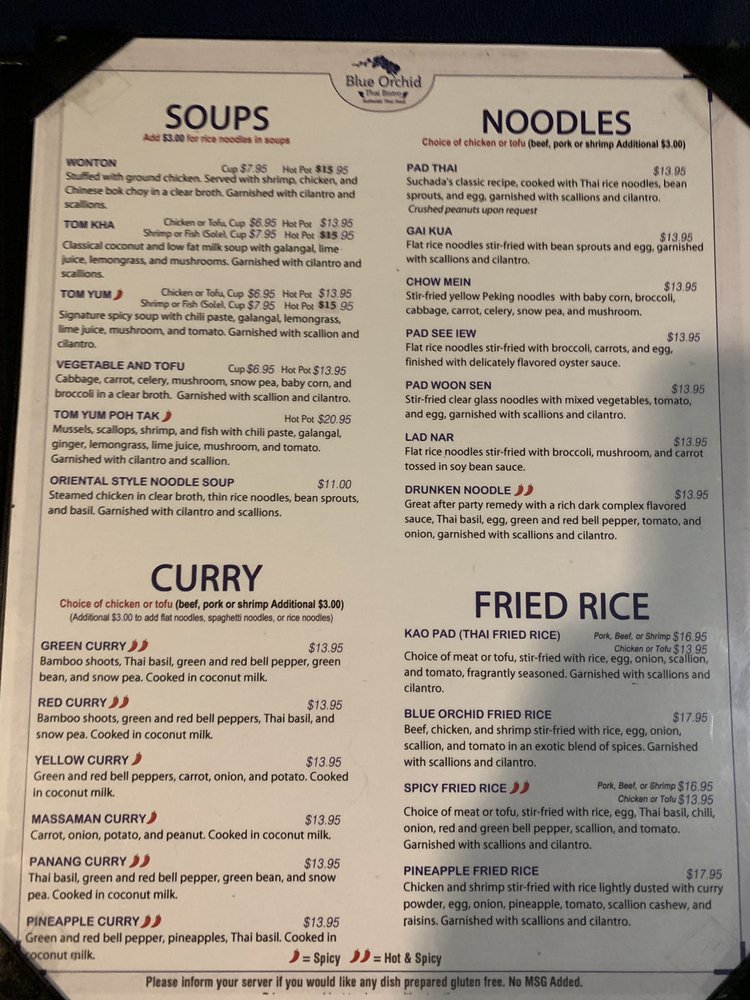 Blue Orchid Thai Bistro offers a diverse menu with options for everyone, including vegan choices, takeout, delivery, and catering services. Located in Palm Desert, CA, this Asian-owned restaurant provides a unique dining experience with its flavorful dishes and attentive service. Customer reviews praise the delicious offerings like the orange chicken, yellow curry, and the spicy drunken noodles. The tangy orange zest and peanutholic dressings are also highly recommended for salads and meat dishes. The Tom Kha soup and Tom Yum hot pot are must-try options for soup lovers. With a comfortable ambiance and a menu filled with affordable yet delectable options like pad thai, green curry, and vegetable rolls, Blue Orchid Thai Bistro is a fantastic choice for any dining occasion.