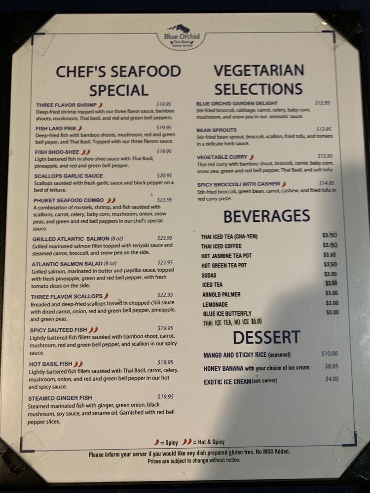 (*Spicy 1 out of 5*) Coated in light batter, deep-fried to golden brown. Topping it off with the famous blue orchid sam rod thai sauce.